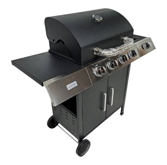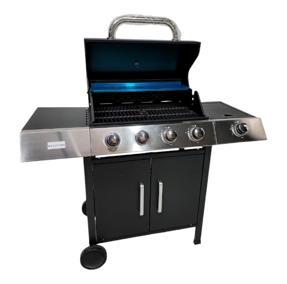 Parrilla 5 Quemadores ideal para actividades familiares, tapa con Termómetro, bandeja de recolección, ruedas para fácil traslado.